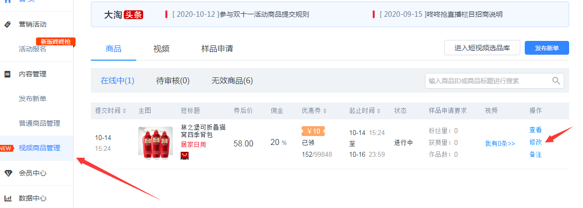 自媒体中心-视频商品管理-修改-补充相应信息即可