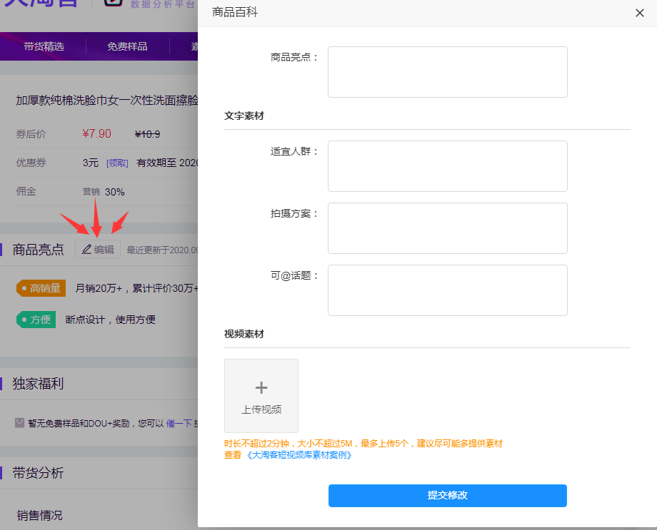 商品百科-商品详情页,点击编辑即可编辑商品亮点、文字素材、视频素材。