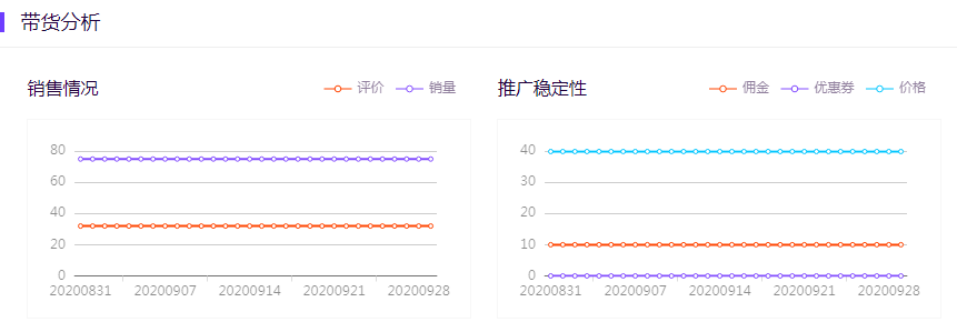 展示商品近30天券、佣金、价格持续时长。曲线若如上图平稳,则代表该商品佣金、优惠券长期稳定,达人可参考选品,降低推广商品中途券、佣金频繁失效的几率。