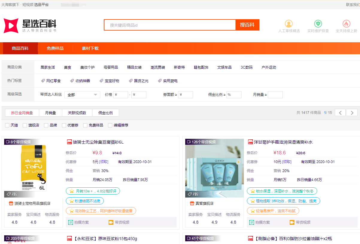 商品由平台运营人员精选推荐,通过对商品亮点的提炼、佣金优惠券稳定性的分析、拍摄方案的打造、视频案例的陈列,让商品更具带货价值、坐拥短视频/直播带货红利,同时实现达人一站式选品带货。