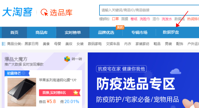 进入大淘客选品库,点击“数据罗盘”即可使用。目前仅支持淘客商品id、链接、淘口令搜索哦!