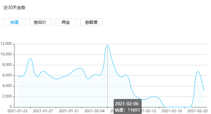 1、可以看到商品近30天销量、券后价、佣金、券额度的走势情况,快速了解商品近期出单能力,帮助您快速做出招商推广决策。