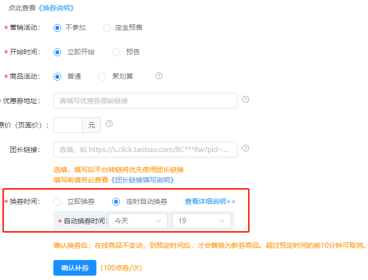 团长放单平台-商品管理-找到需要换券的商品-点击换券-换券时间可选立即换券或者定时自动换券