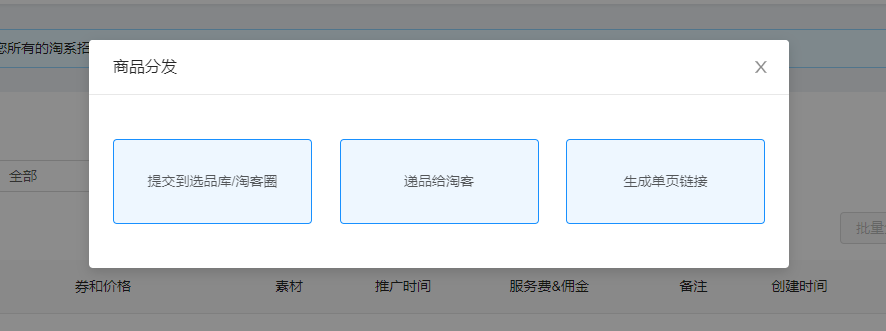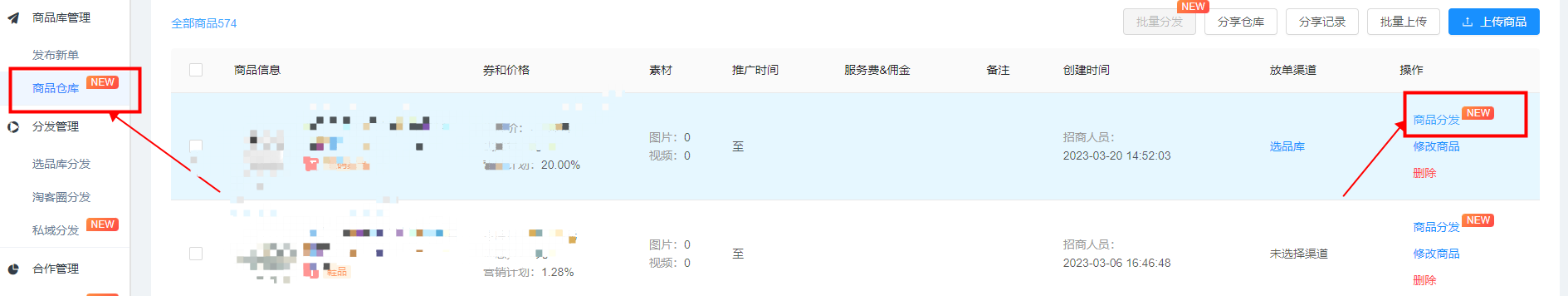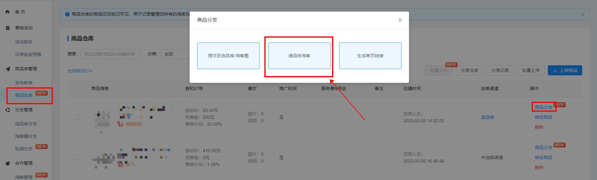 在【商品仓库】中选择商品后的【商品分发】,可把该商品直接分发给关注您的推广淘客