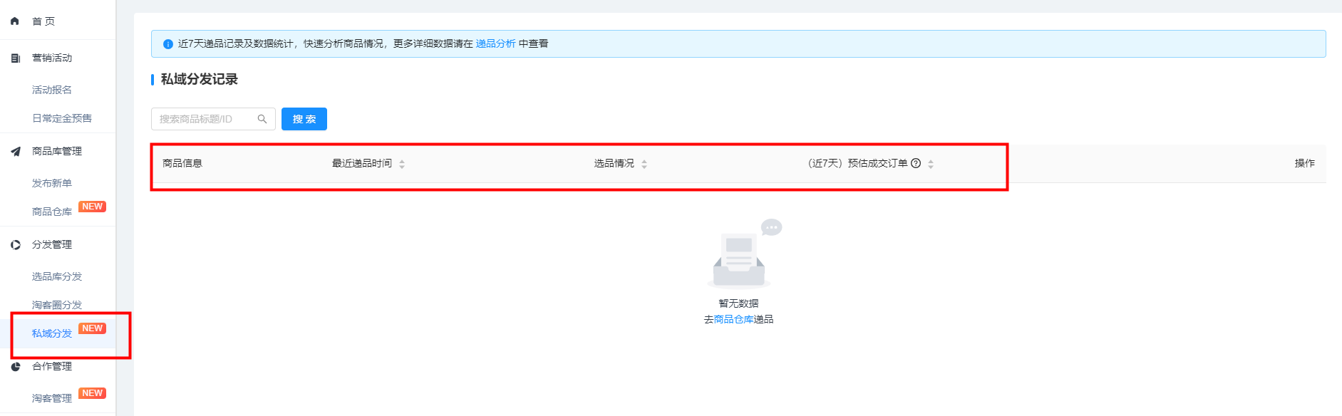 可在【私域分发】中查看商品的信息、递品时间、选品情况、(近7天)预估成交订单