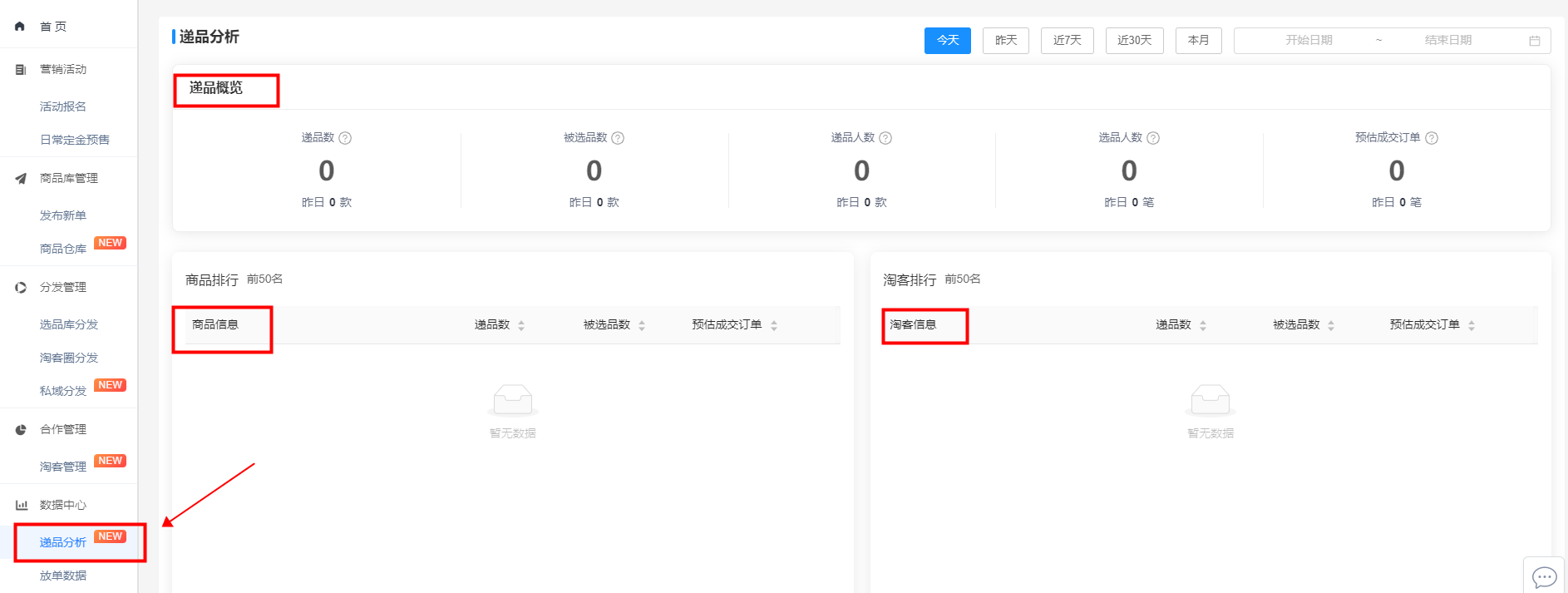 可在【递品分析】中看到“递品概览”,包括“递品数”“被选品数”等,也可查看“商品信息”、“淘客信息”。