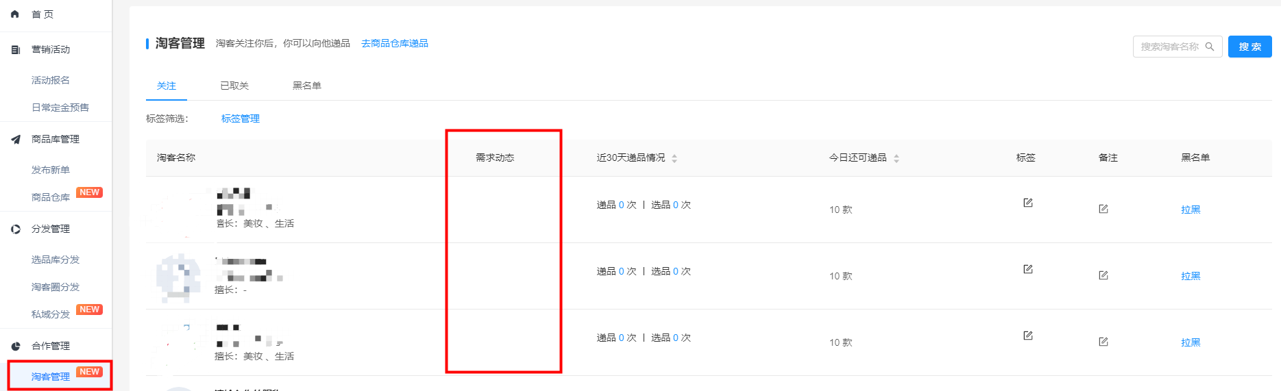 可在【淘客管理】中看到关注您的推广淘客的需求动态,在【商品仓库】中您可将其所需商品单独递给推广淘客,商品将直接出现在推广淘客的【选品管理中心-商品动态】中。