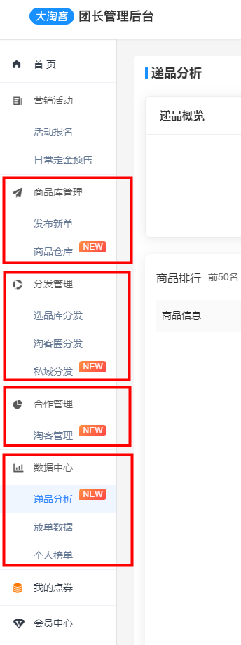 1、团长管理中心的菜单结构调整,使得团长业务数字化流程变得更合理,提升整个业务流程的效率。