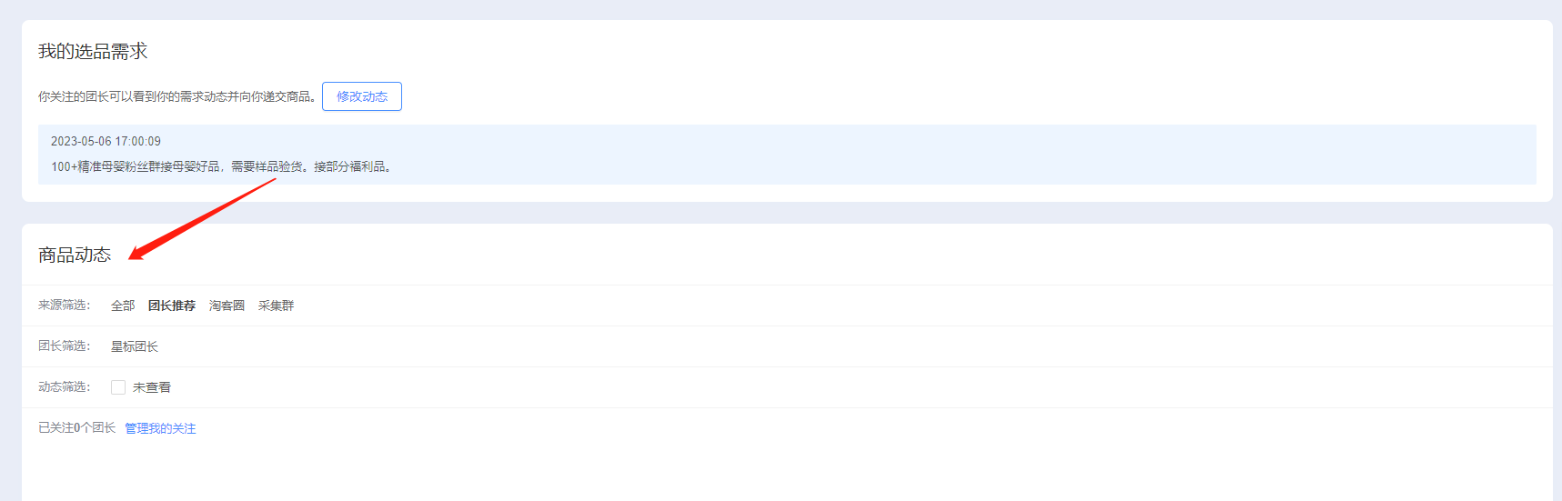 示例:当推广淘客关注了您的团长主页后,推广淘客可在【选品管理中心—商品动态—添加动态】向您发布商品需求,您可在【淘客管理】查看到推广淘客的商品需求,然后通过【商品分发】或【批量分发】工具向推广淘客递品。