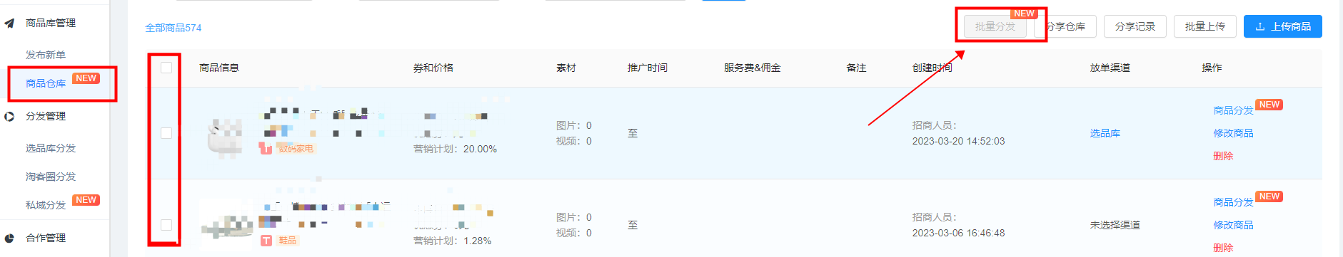 在【商品仓库】中选择【批量分发】,可把商品批量分发给关注您的推广淘客