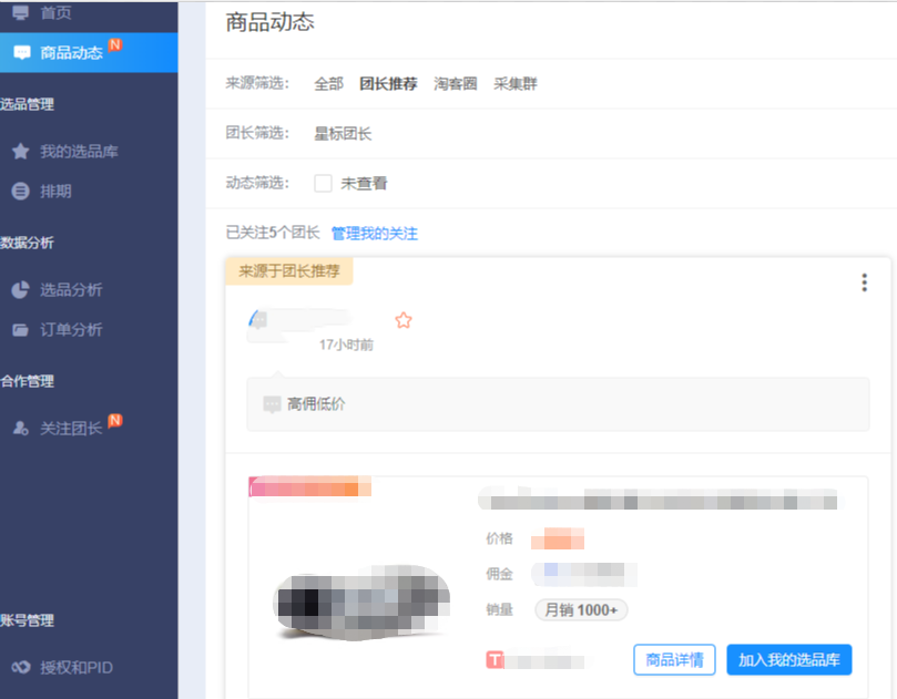 商品展示位置:淘客选品管理中心—商品动态—团长推荐