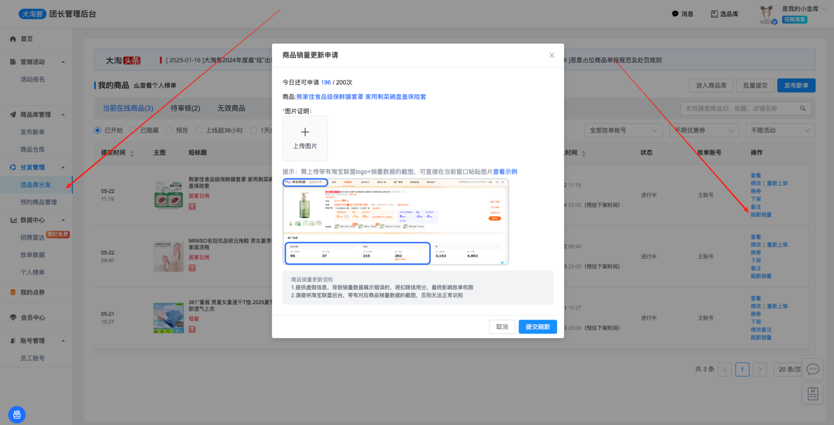 1.在「团长放单后台」-「选品库分发」页面 ☞ 点击「刷新销量」按钮,即可进入销量更新流程。