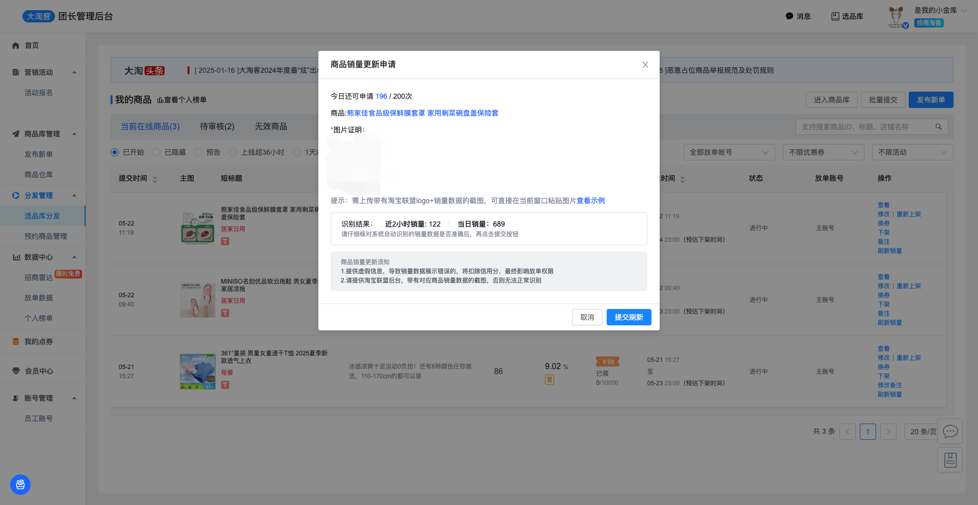 ① 数据真实性要求:上传的截图必须为当前时间的淘宝联盟商品页面真实截图,严禁伪造或使用过期数据。若发现虚假数据,平台将扣除信用分,暂停销量刷新权限,严重者将影响放单权限。