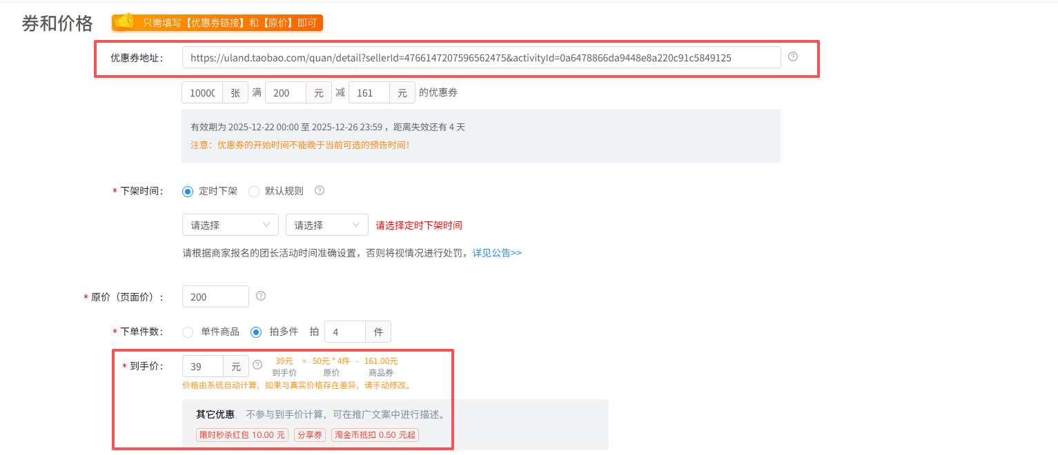 → 填写后,自动解析并显示“实际券后价”