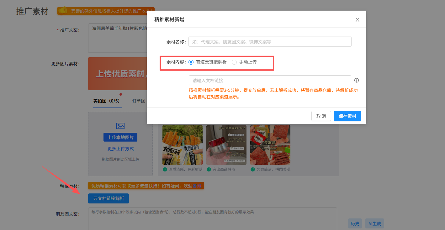 → 原“精推素材”旁按钮已升级为【云文档链接解析】;