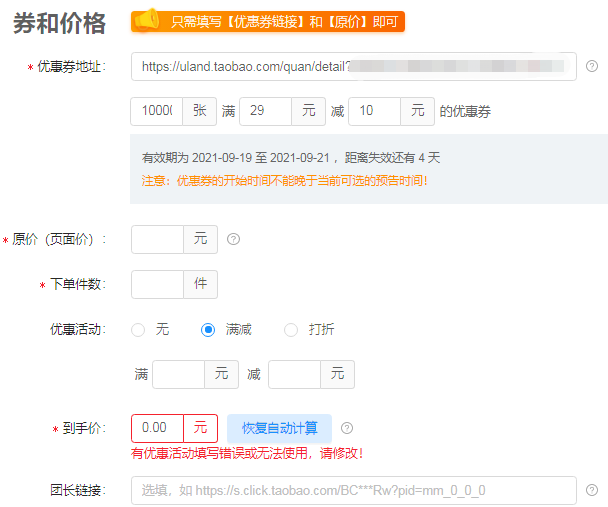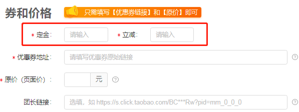 三、填写券和价格信息(只需填写优惠券链接和原价)