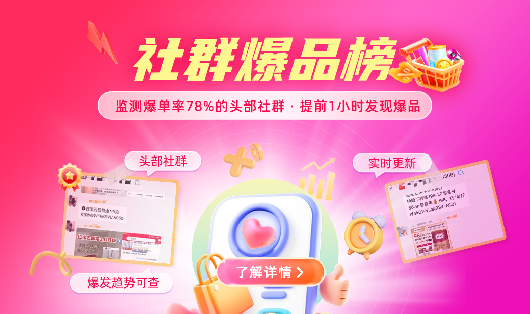 「社群爆品榜」带着王炸数据杀来了!实时监测头部社群的爆单数据,为您提供实时、精准、可溯源的爆品趋势,提前锁定热销机会,提升推广效率!