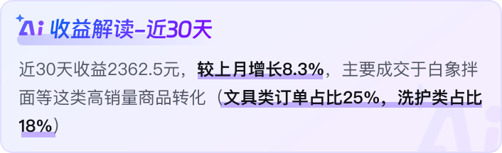 自动分析近30天数据,从订单、佣金、品类、渠道等多维度定位收益变化原因。无论是单品暴涨还是推广错位,AI结论让您一目了然,告别人工统计的耗时与遗漏。