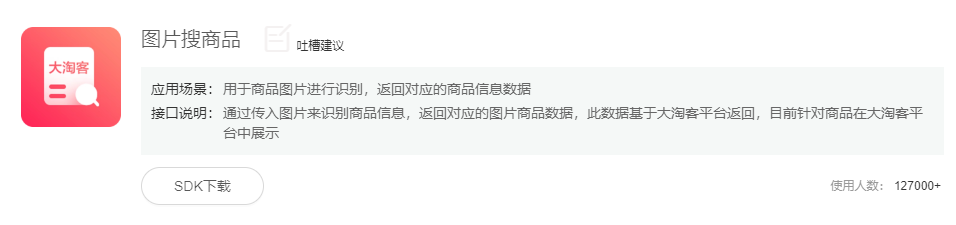接口名称:图片搜商品接口说明:通过传入图片,接口可快速识别商品信息,并返回基于大淘客平台的相关图片商品数据。目前,该接口针对在大淘客平台中展示的商品进行精准搜索。应用场景:用于对商品图片进行识别,能够准确返回对应的商品信息数据。