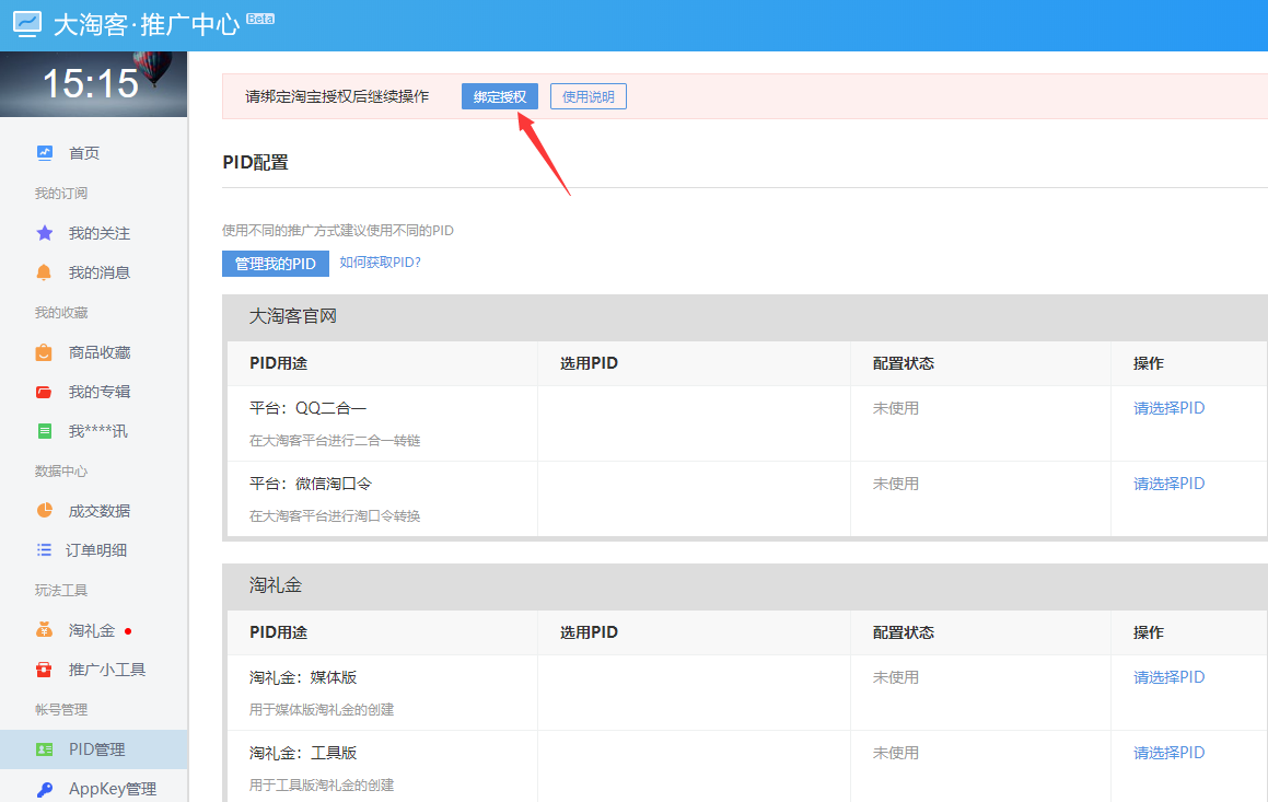 三、在大淘客推广中心,绑定pid,并授权,对应页面链接:https://www.dataoke.com/pmc/pid-manager.html