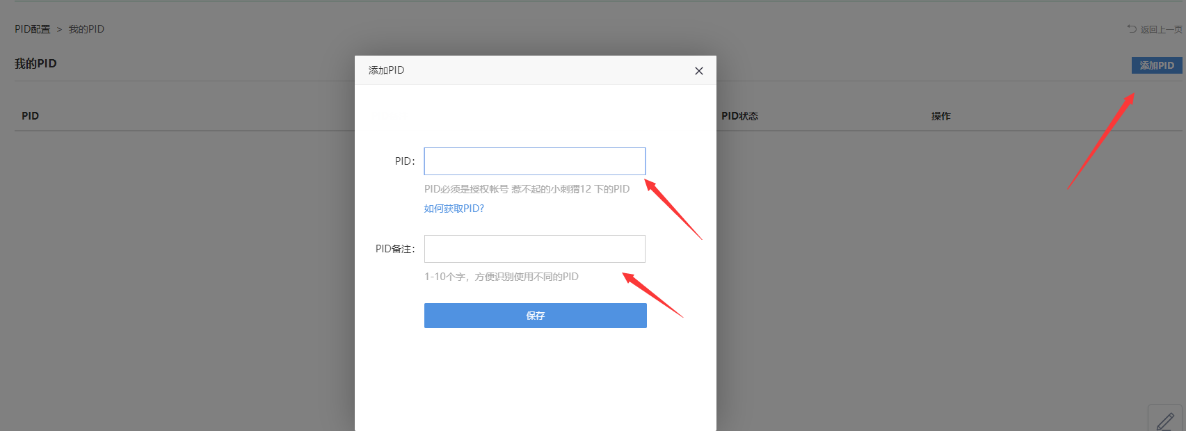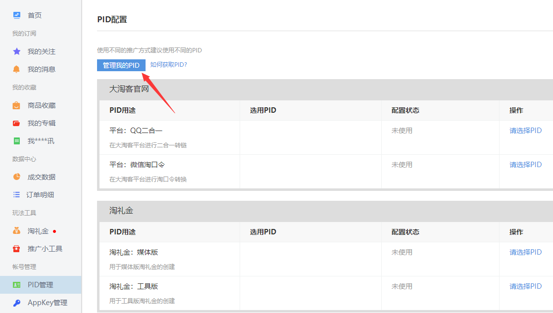 3、点击管理我的pid,保存并添加联盟生成的pid