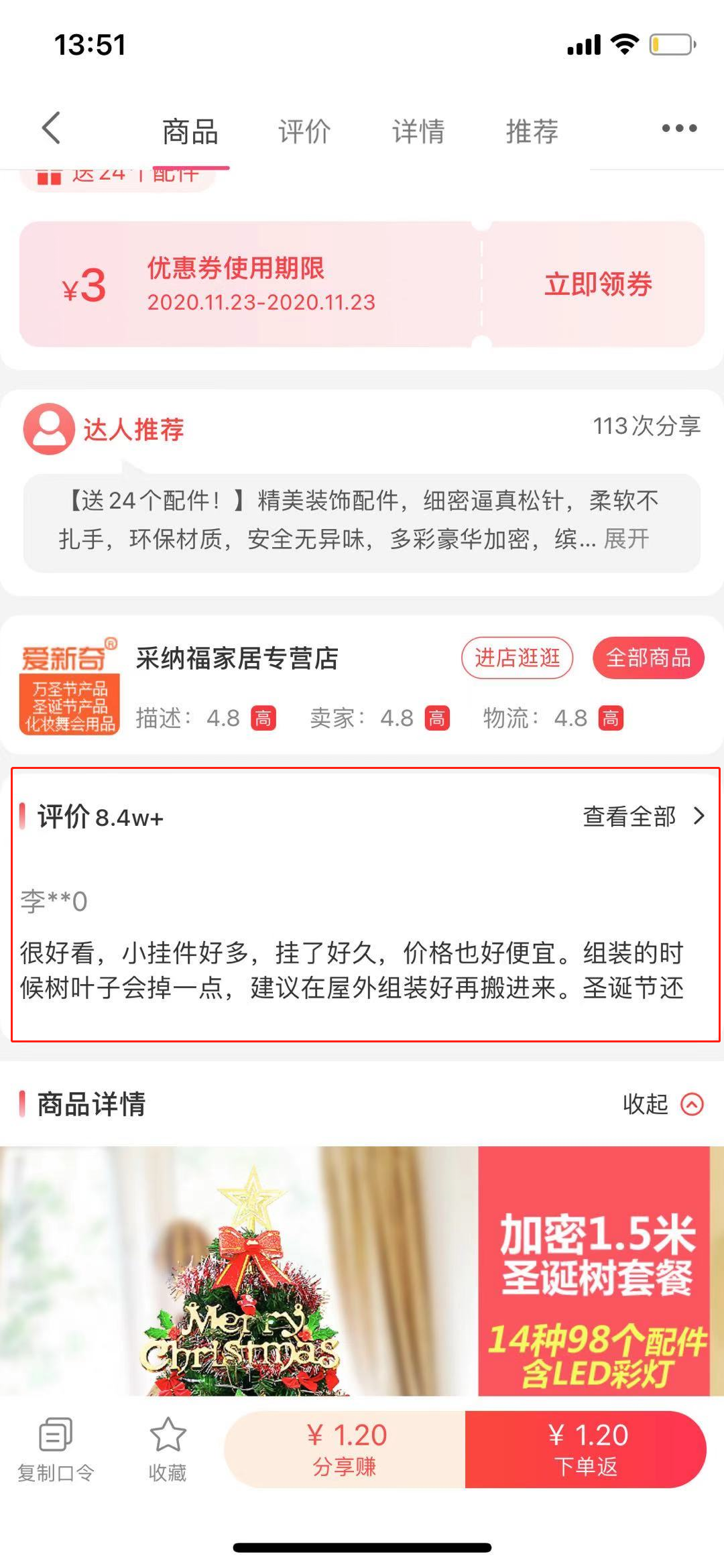 使用场景:可用于商品详情页中,展示该商品在淘宝/天猫的评论情况