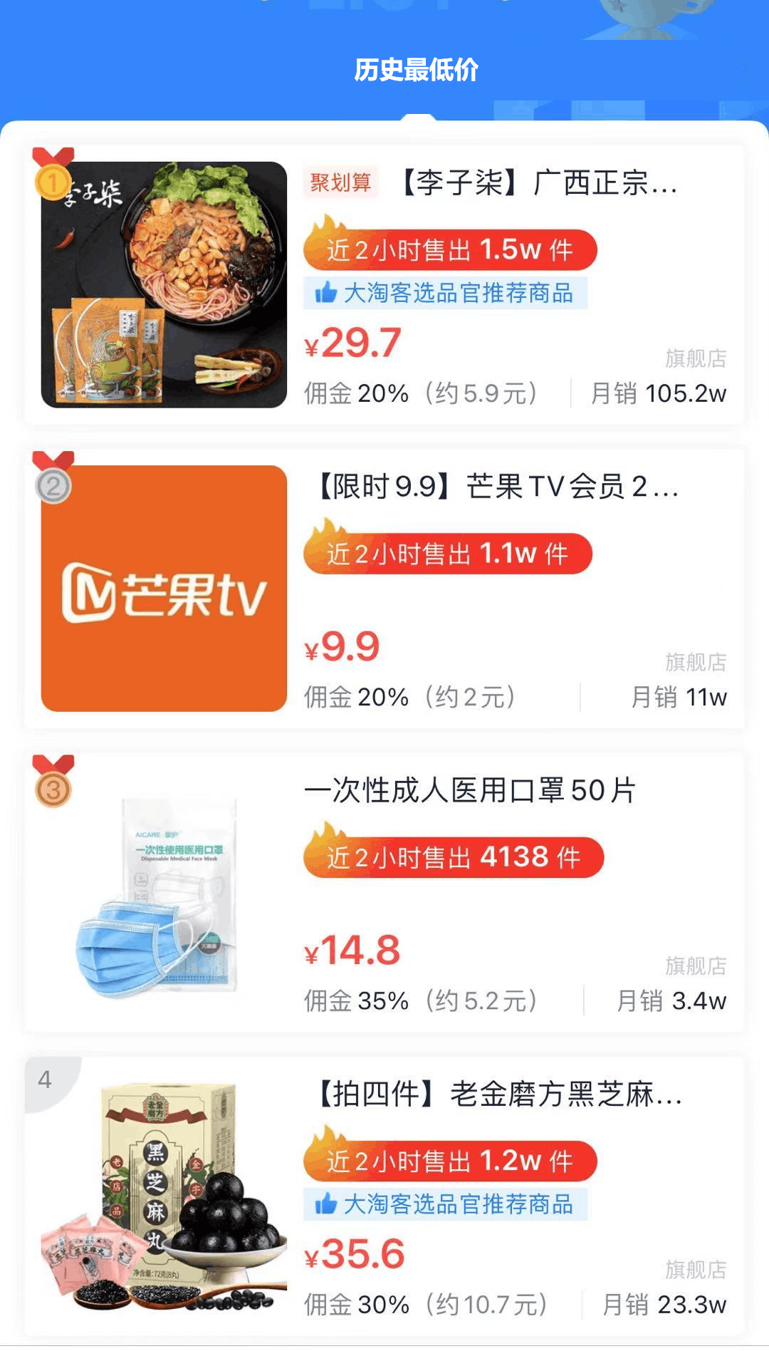 接口说明:该接口返回上架大淘客历史最低券后价的商品合集