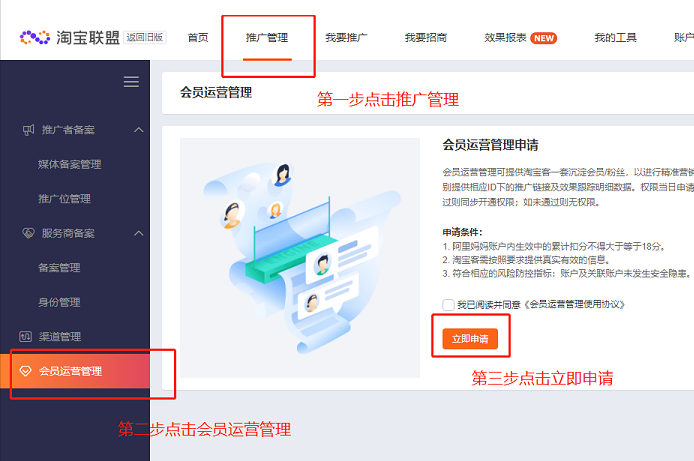 1)、推广者在联盟后台的会员运营管理内签订过协议,已经具有会员运营管理权限