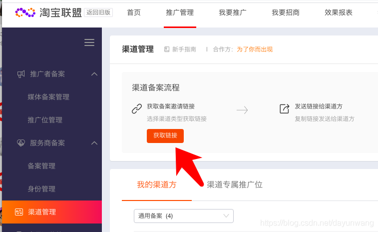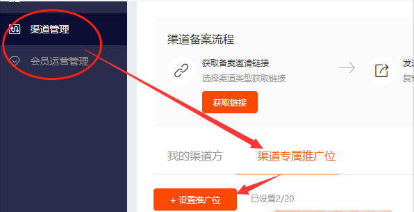 具体位置在:联盟后台——推广管理——渠道管理/会员运营管理