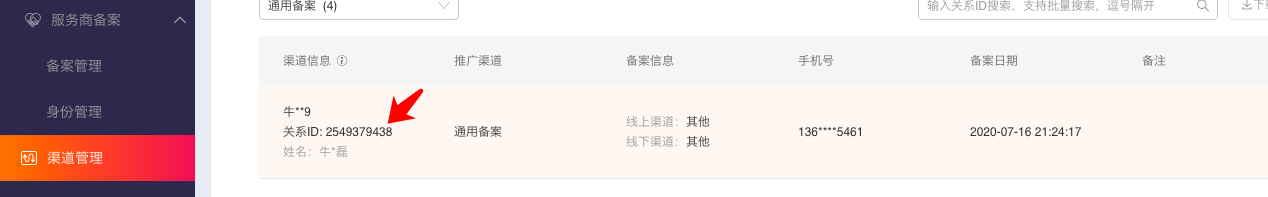其中渠道备案之后我们可以在后台直接看到备案的渠道方和渠道关系ID