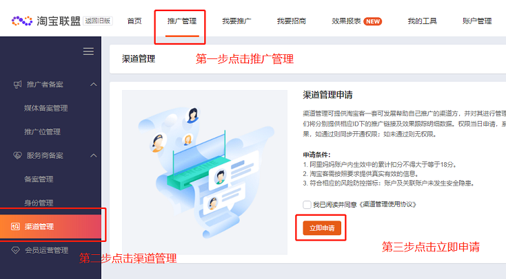 从2020年8月20号开始,渠道管理与会员运营管理都不需要填写原来的申请表进行申请,全部都在淘宝联盟管理后台可以自助申请与审核,只要阿里妈妈账号累计扣分没有大于等于18分,具有真实的有效身份信息,通过风控指标都会审核通过。