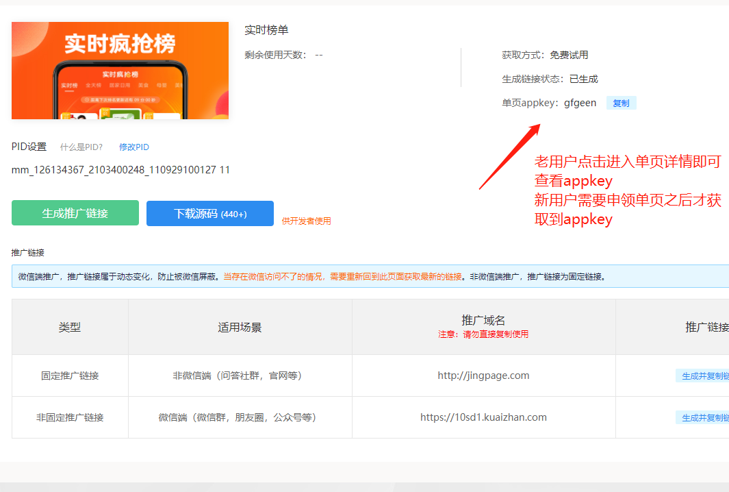 答:新申请单页的用户可在授权PID的时候获取appkey并下载,之前申请过单页或者想查看单页appkey的用户可在单页详情中右侧查看