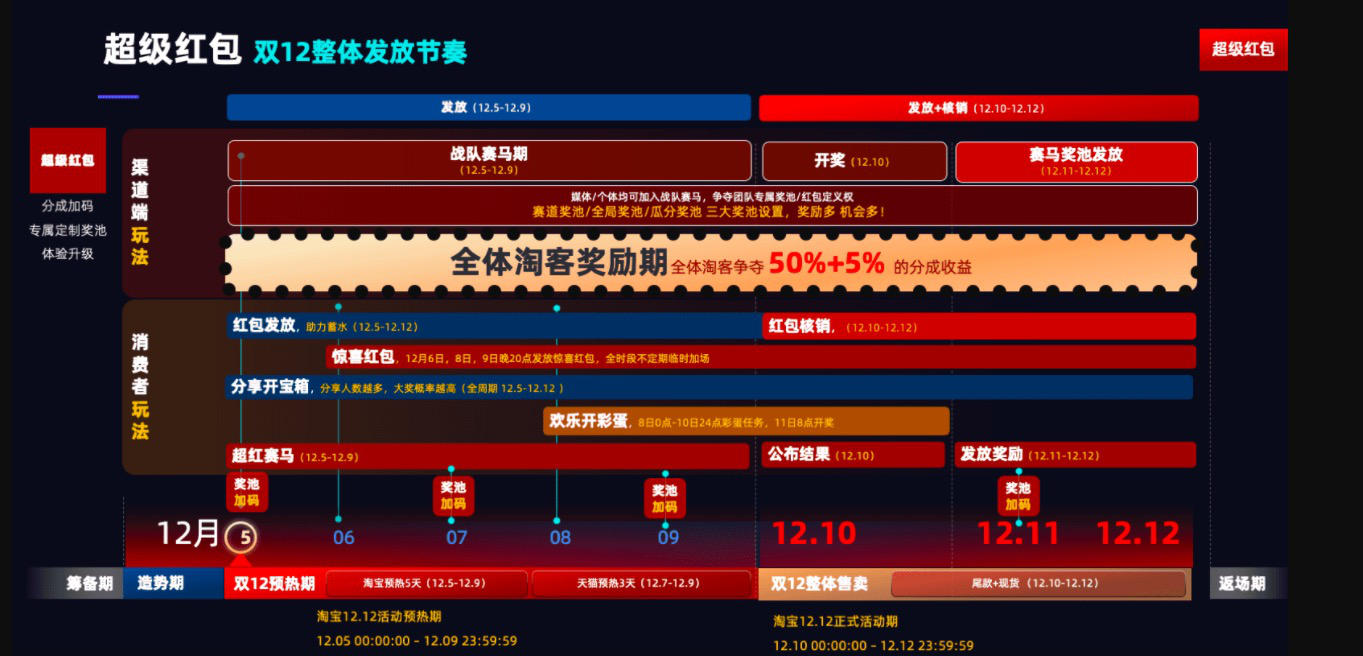 这个阶段为拉新期,超多免单玩法商品集合。平台将精选双12 免单信息、福利单、淘礼金形式免单、淘礼金形式返利的商品,广泛拉新,多个场景同时分发,触达更多用户。