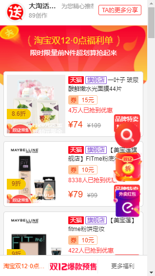 0点福利单:主推0点限时限量的商品(如0点抢BUG价、前1000件半价等),可以通过加入收藏操作,将整个楼层商品以专辑的形式打包推广。