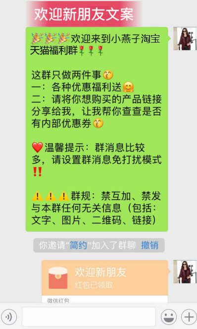 第二个需要准备的文案就是欢迎新朋友的文案,但我们的群里面有新朋友加入的时候,我们作为群主第一时间发一段文案进去,接着那发一个红包啊,然后@他,欢迎亲爱的来到我们的福利群,消息比较多,请设置群消息免打扰的模式。
