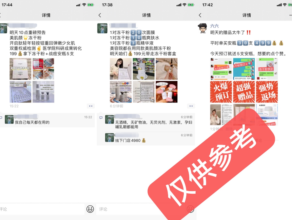 如果你不确定这款商品有哪些人喜欢,可以先通过朋友圈种草一下,种草朋友圈可以是3条,第一条是种草这个化妆品的品牌背景,第二条朋友圈种草化妆品的功效和实拍验货,第三条朋友圈就是集赞预定。