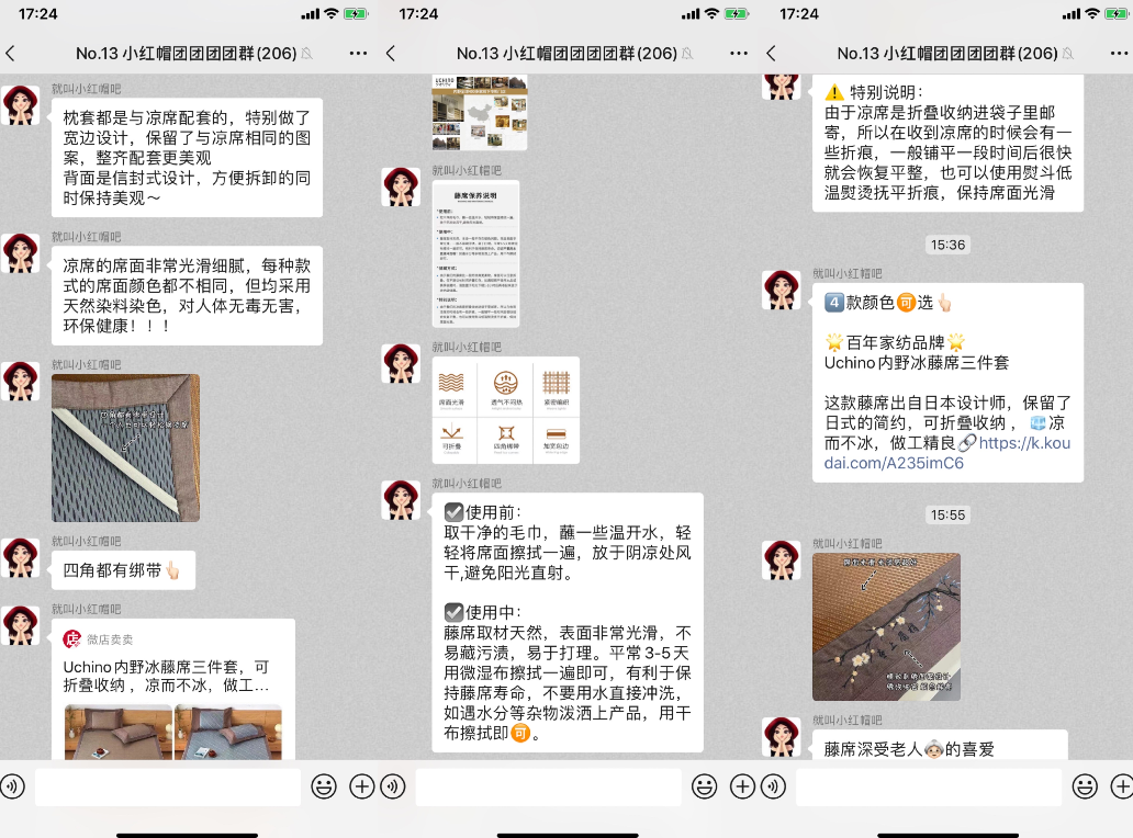 社群推品和私聊不太一样,微信群是一对多的,社群推品主要就是阐述该商品的细节,文案不要过长,简短的基础上要充分说明清楚细节点,让用户一看就明白,不要给用户有阅读压力,文案、图片、视频、多个素材的巧妙的穿插,视觉美观容易刺激用户形成购买。
