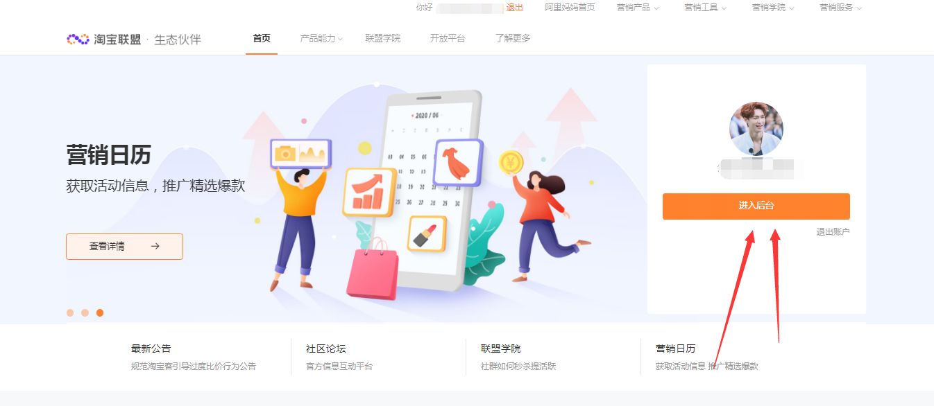 进入到淘宝联盟,登录后进入后台(下图1)即可查看账号等级以及佣金获得情况。