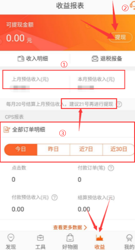 2)收益查看位置:点击下方“收益”即可查看(下图①)/提现(下图②)佣金收入,订单明细(下图③)。