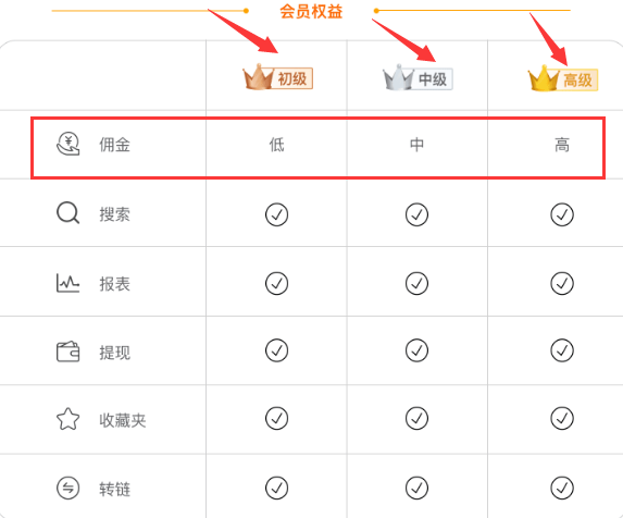 例:A商品价格10元,佣金20%,如果联盟账号是高等级,那么就可获得10*20%=2元的佣金,而中级和低级用户则不会获得全部佣金。