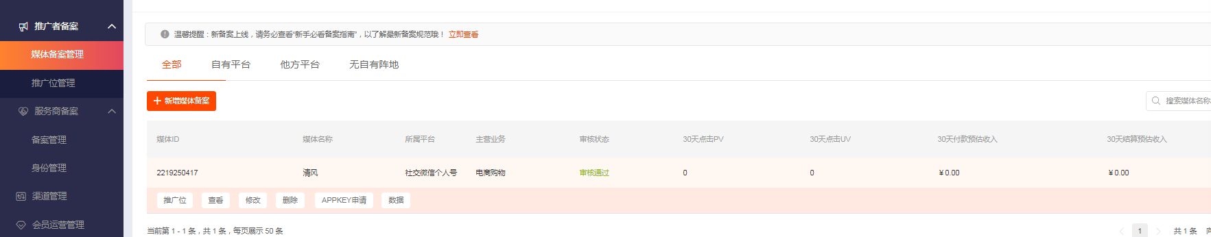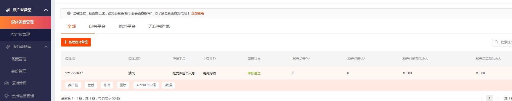 4)审核通过后,即可在媒体备案管理查看备案信息。