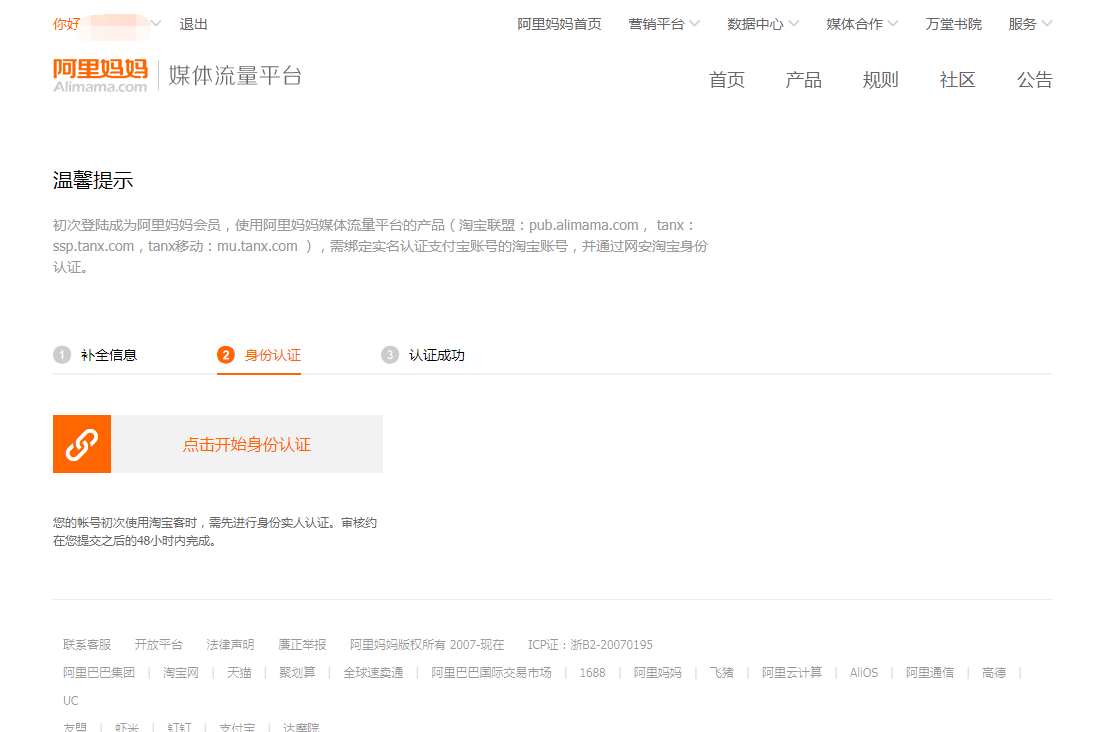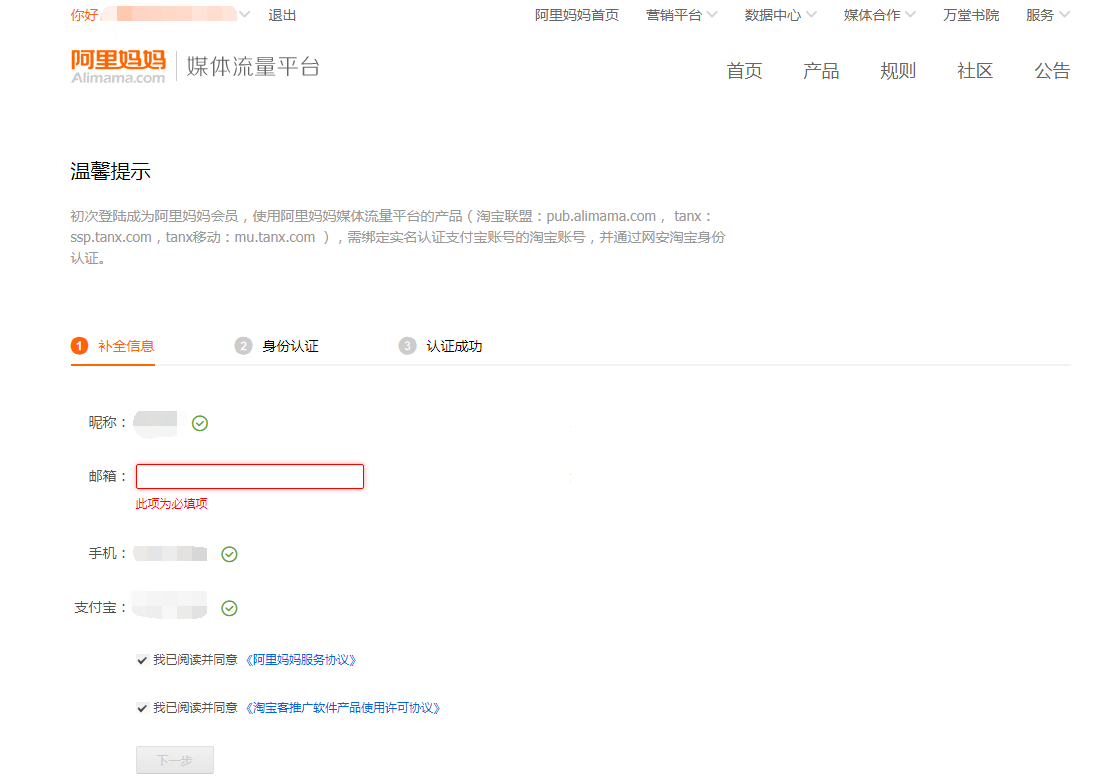 2)首次登录淘宝联盟的账号需补全信息和身份认证,按照如下步骤填写邮箱进行激活。