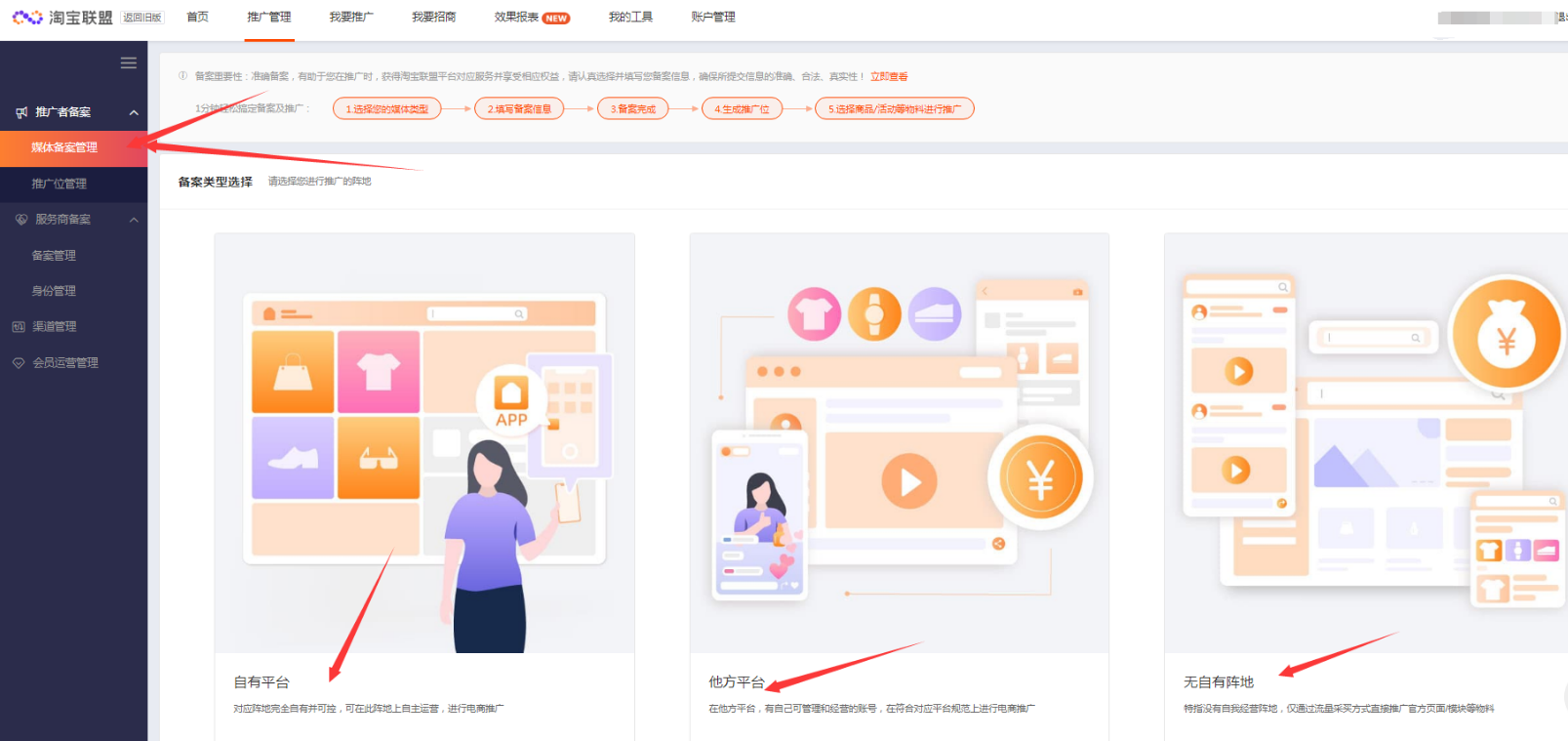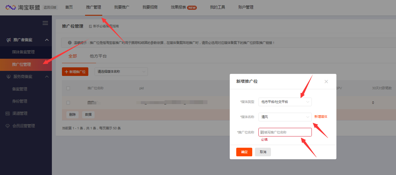 1)选择“推广位管理-新增推广位”,选择“媒体类型”“媒体名称”“推广位名称”(填写方便区分的名称即可)的信息,点击确定即可。