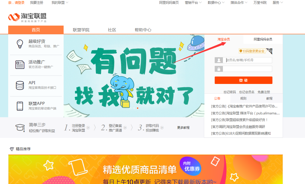 1)进入淘宝联盟官网,选择“淘宝会员”用淘宝账号和密码登录。