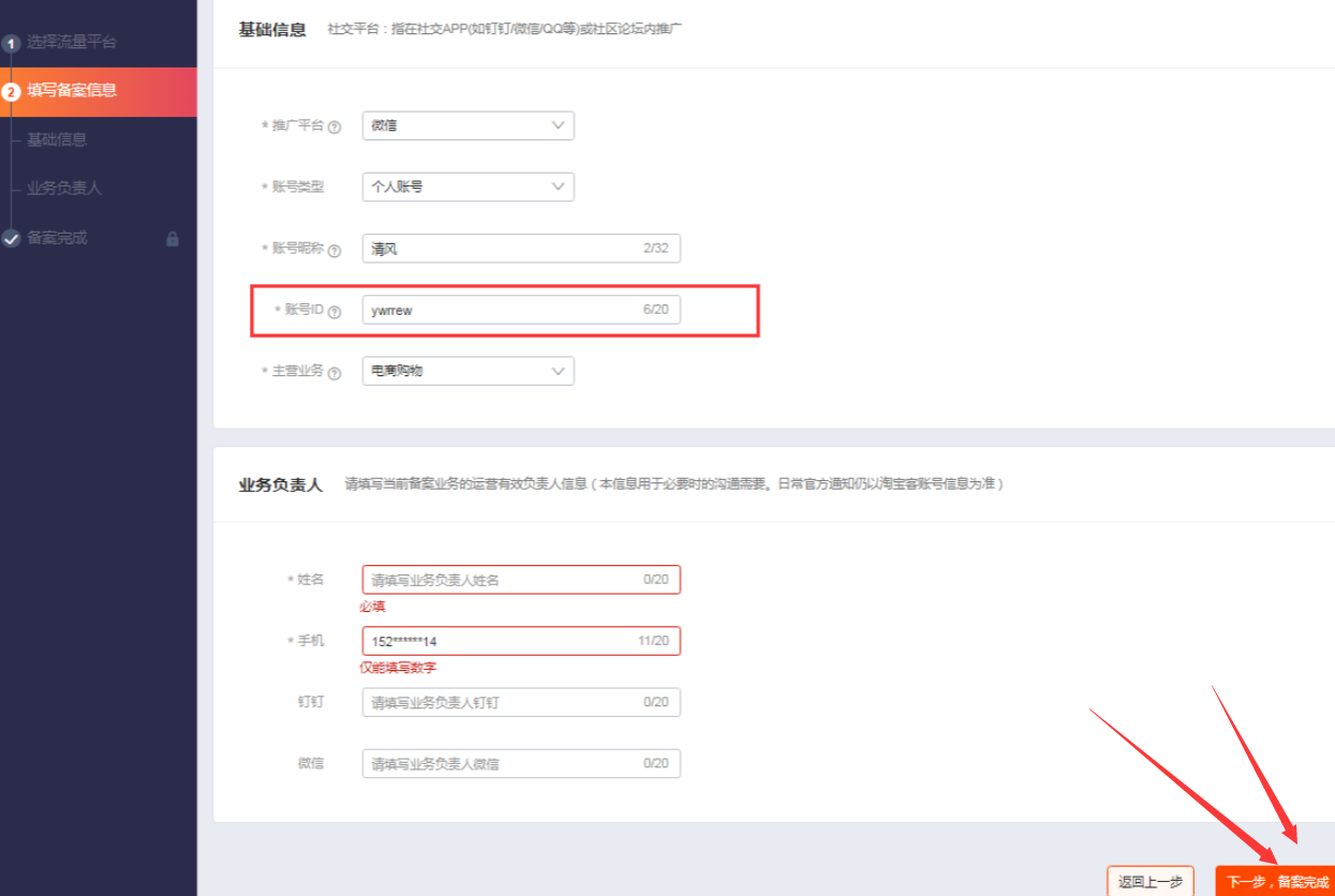 3)填写备案信息
