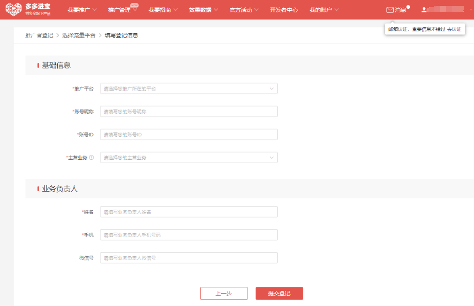 2、如果有引导填写信息,按照引导完成即成功拥有多多进宝账号
