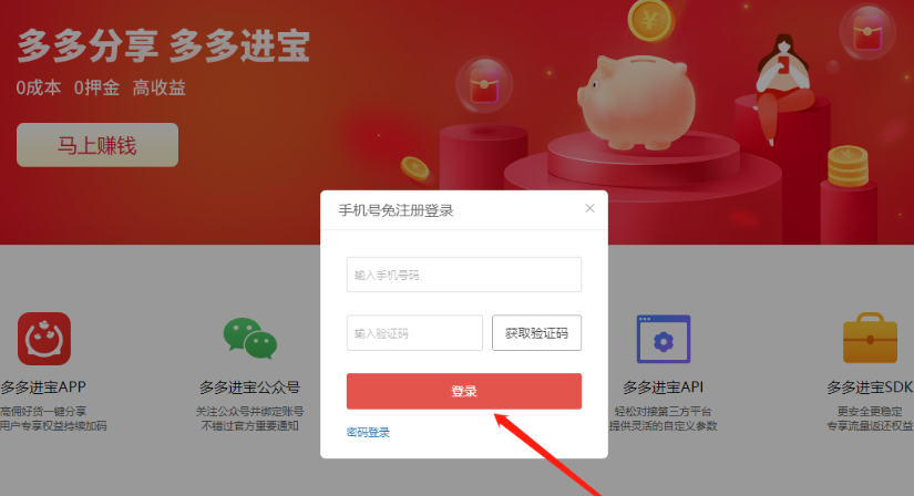 1、打开多多进宝官网,用手机号登录