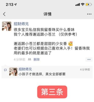 当然针对不同的客户人群促单的话也可以适当改改,如果我的朋友圈宝妈居多,我可能会改成“我老公说还是小苍兰的最好闻,还让我多屯几瓶