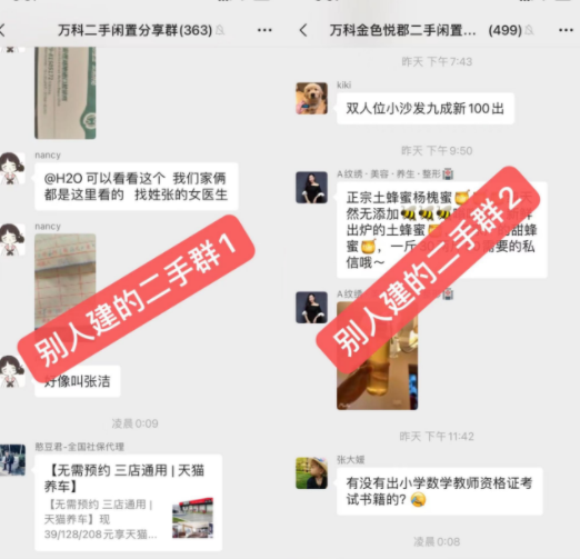 然后下面就会有好多邻居说,把我也拉一下同理,像业主群、砍价群、拼车群,二手群也特别受欢迎