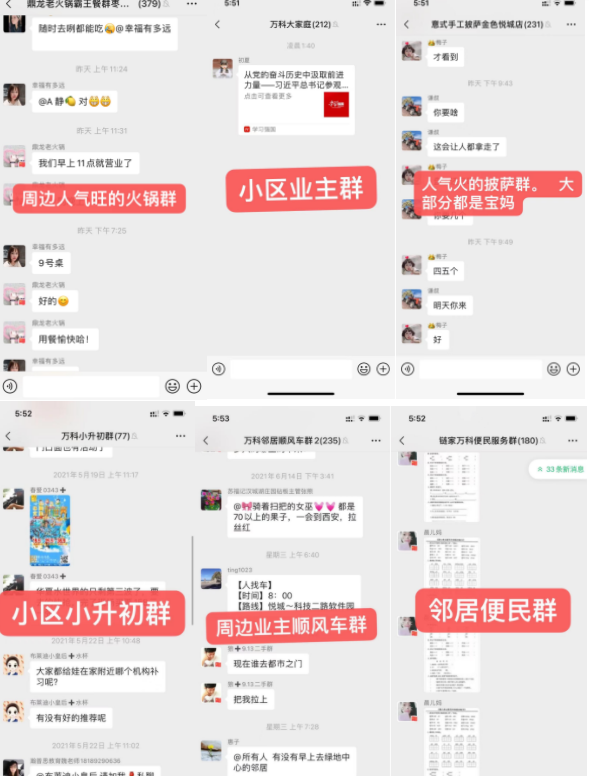 有业主群、拼车群、蔬菜群、孕妈群、二手群、砍价群、小升初群、维权群、美食群。